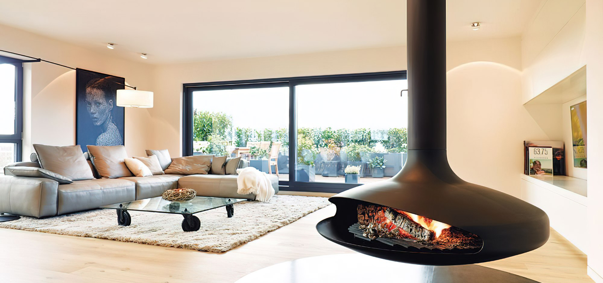 Lareira a lenha suspensa, para aquecimento de grandes áreas.