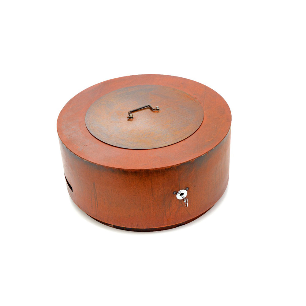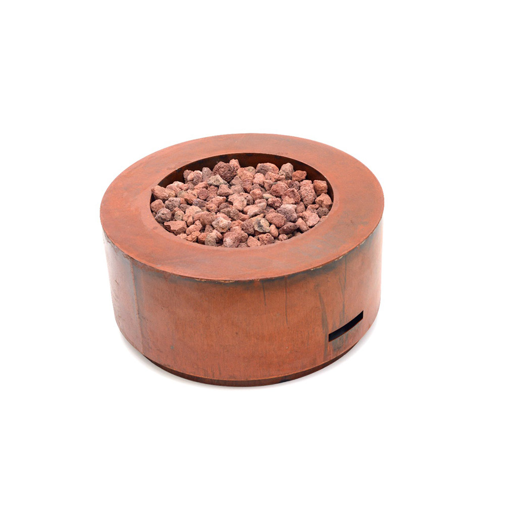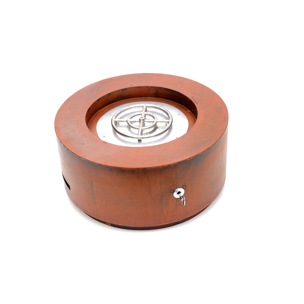 Base em Aço Corten Pré-oxidado e queimador redondo em Aço inoxidável AISI 304. MATERIAL COM ACABAMENTO RÚSTICO, que vai continuar oxidando com a exposição ao tempo.