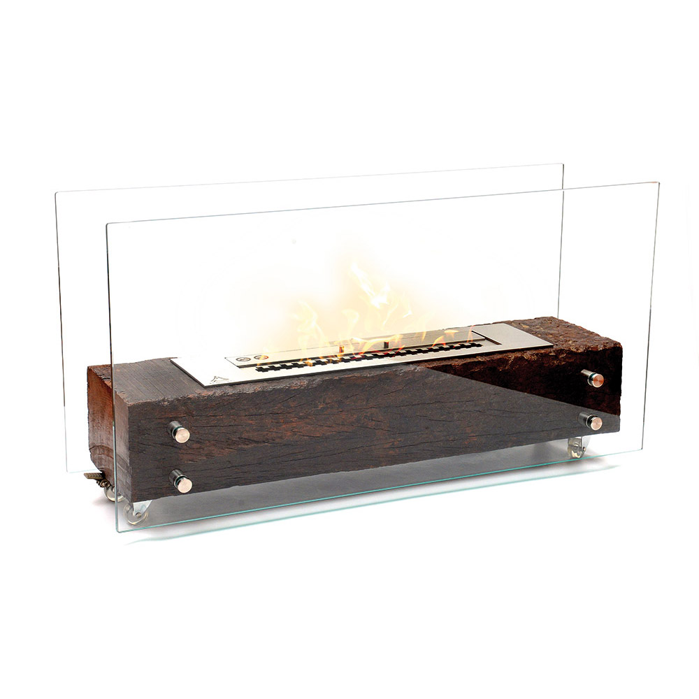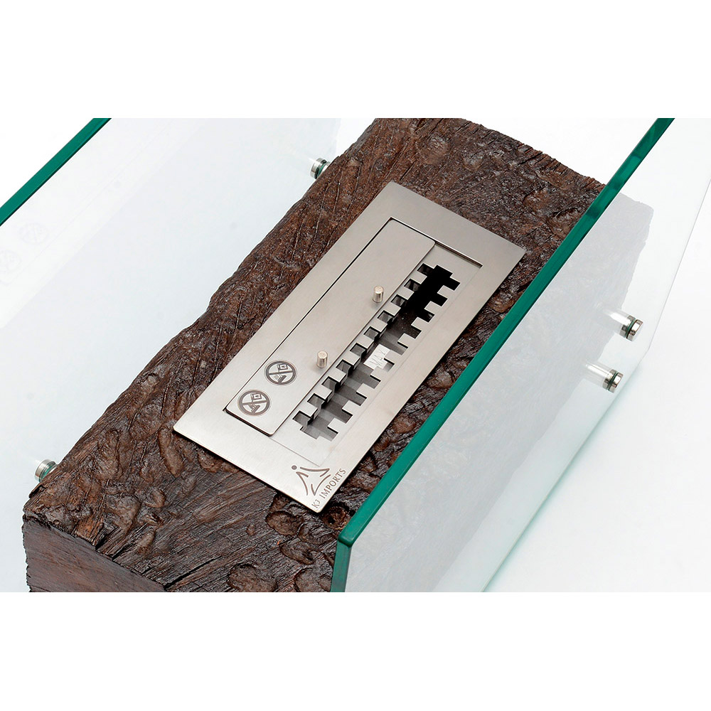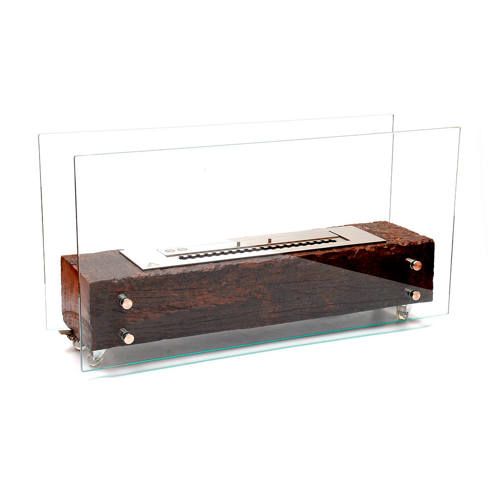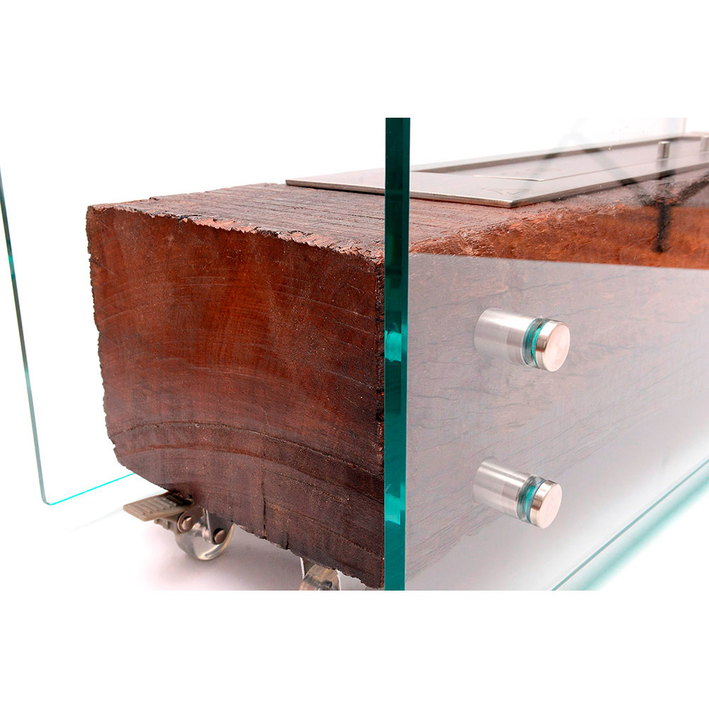 Base em Dormente de Madeira Rústica e queimador inoxidável retangular em Aço inoxidável. Equipamento para decoração e aquecimento de área interna.