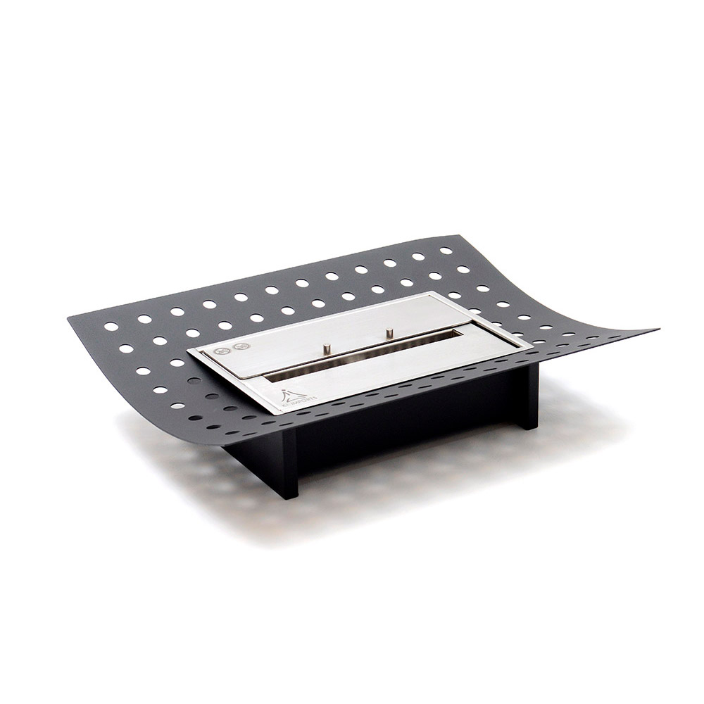 Base em Chapa Metálica e queimador inoxidável retangular em Aço inoxidável. Equipamento para decoração e aquecimento de área interna.